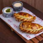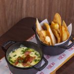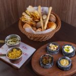Pães artesanais, copinhos de queijo e antepastos variados.
