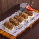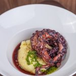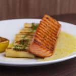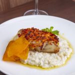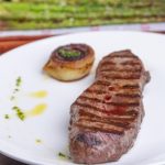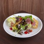 Folhas verdes, croutons de mignon angus e brie maçaricado sobre massa filó, ao molho de mostarda com aspargos frescos.