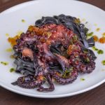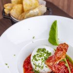 Ao pesto, com chips de Parma, cebolete defumado, rúcula e purê de tomate San Marzano.