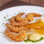 Alface americana, camarões grelhados ao mel de Dijon, pétalas de parmesão, mini rúcula, gomos de tangerina e nozes tostadas no mel.