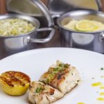 Fios de azeite de manjericão defumado, pétalas de parmesão e alcaparras.