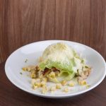Folhas verdes, peito de frango defumado na parrilla e croutons, ao molho de mostarda, com algodão de parmesão.